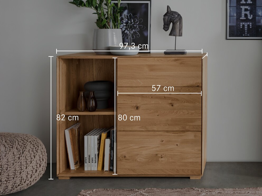 La qualité de fabrication et le caractère du bois sont mis en avant. Un caisson élégamment fraisé à l’avant et des façades sans poignées soulignent le concept global. Le grand buffet 3 portes « Civenna » offre beaucoup d’espace de rangement, sans paraître massif. Les portes de ce meuble élégant sont dotées de joints creux, qui structurent la façade.