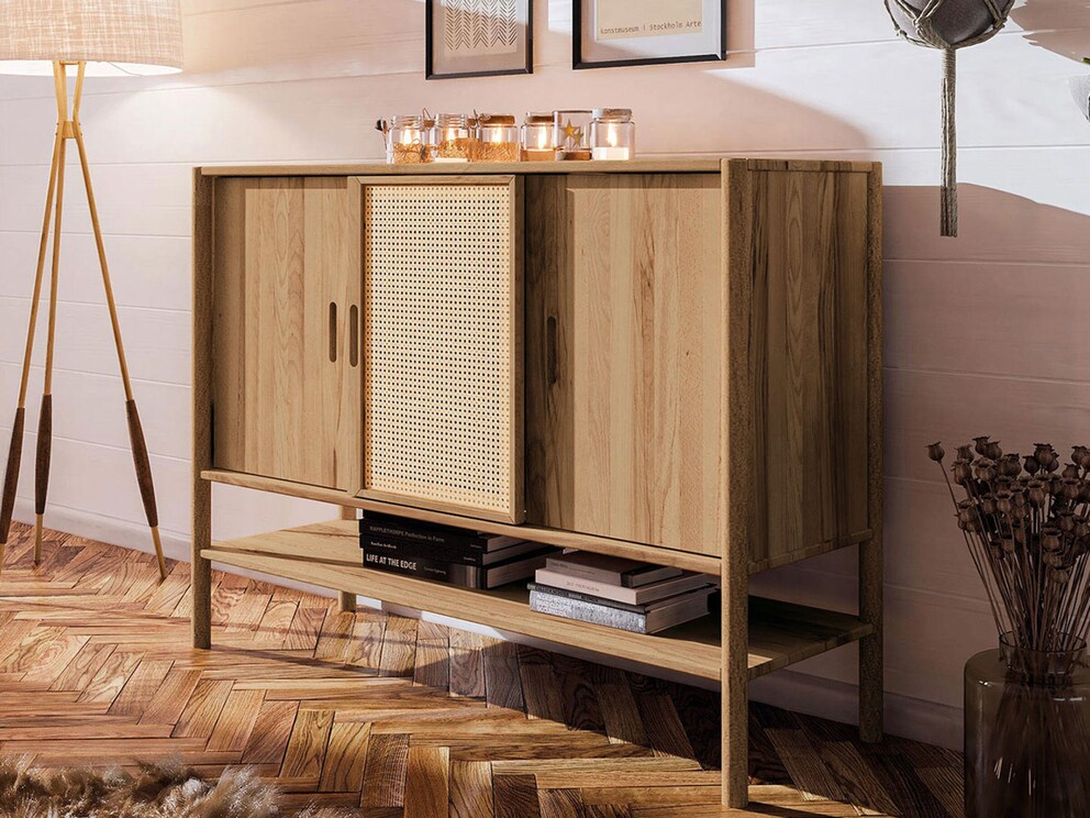 « Rota » s’intègre, avec ses formes harmonieuses et agréables, à de nombreux styles d’intérieur. Des pieds colonnes élancés, parfaitement encastrés de façon artisanale dans le plateau supérieur, confèrent à ces beaux meubles une impression de légèreté aérienne. Des poignées intégrées agréables au toucher soulignent le design chaleureux. Un autre détail charmant : sur certaines variantes, un cannage viennois artistique est intégré, apportant à votre intérieur une touche de charme façon café viennois. Nous vous proposons 4 variantes de ce buffet pratique : parfois avec tiroirs et compartiments, parfois avec une étagère ouverte supplémentaire. Laissez-vous séduire !