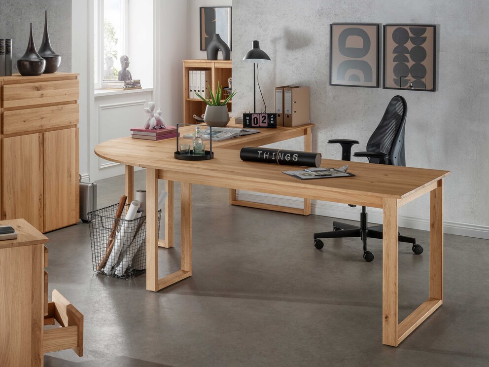Ce bureau crée une base calme pour un travail concentré. Le chêne sauvage massif au grain vivant apporte une chaleur naturelle au bureau et crée une atmosphère agréable. Quatre tailles de 100 à 160 cm de largeur offrent la solution adaptée à différents concepts d'aménagement. L'élément d'angle en option permet de relier plusieurs tables de manière flexible. Fabriqué en Allemagne et doté d'une finition de haute qualité, ce bureau offre une qualité durable et une ambiance moderne.