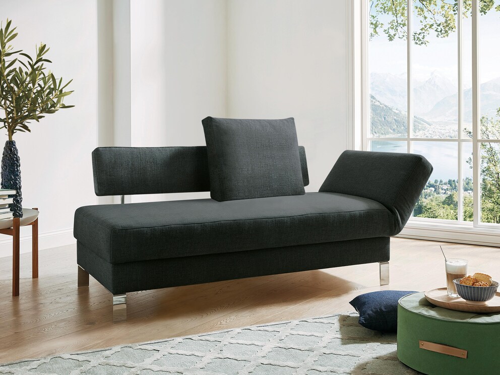 Le canapé convertible 2 places « Lucido » s'impose par ses formes marquantes, son aspect aérien et son élégance moderne. L' appuie-tête réglable en 8 positions invite à se détendre et s'adapte à toutes les positions préférées. Le dossier rabattable en 5 positions peut être complètement abaissé et se transforme en surface de rangement pratique. Vous disposez ainsi d'un refuge flexible pour des heures de détente et des nuitées spontanées. Le tiroir de lit spacieux peut accueillir couvertures et oreillers, prêts pour des nuits confortables. De nombreux accessoires tels qu'une lampe de lecture, un plateau et des coussins supplémentaires complètent avec style ce concept moderne.