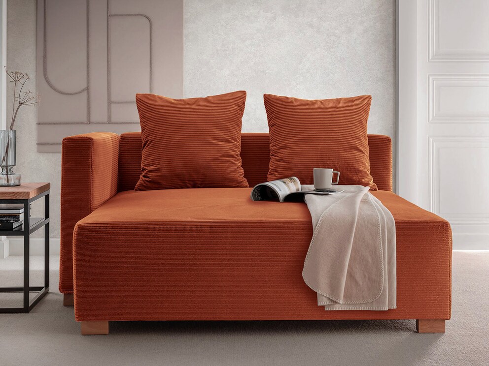 Vous avez le choix entre deux revêtements haut de gamme : le tissu coton-lin à tissage lisse « Hot Madison » pour une allure contemporaine, ou un velours côtelé doux en fibres recyclées durables pour une ambiance lounge décontractée. Tous deux sont doux pour la peau et résistants. L’accoudoir est montable des deux côtés pour une grande flexibilité d’aménagement.