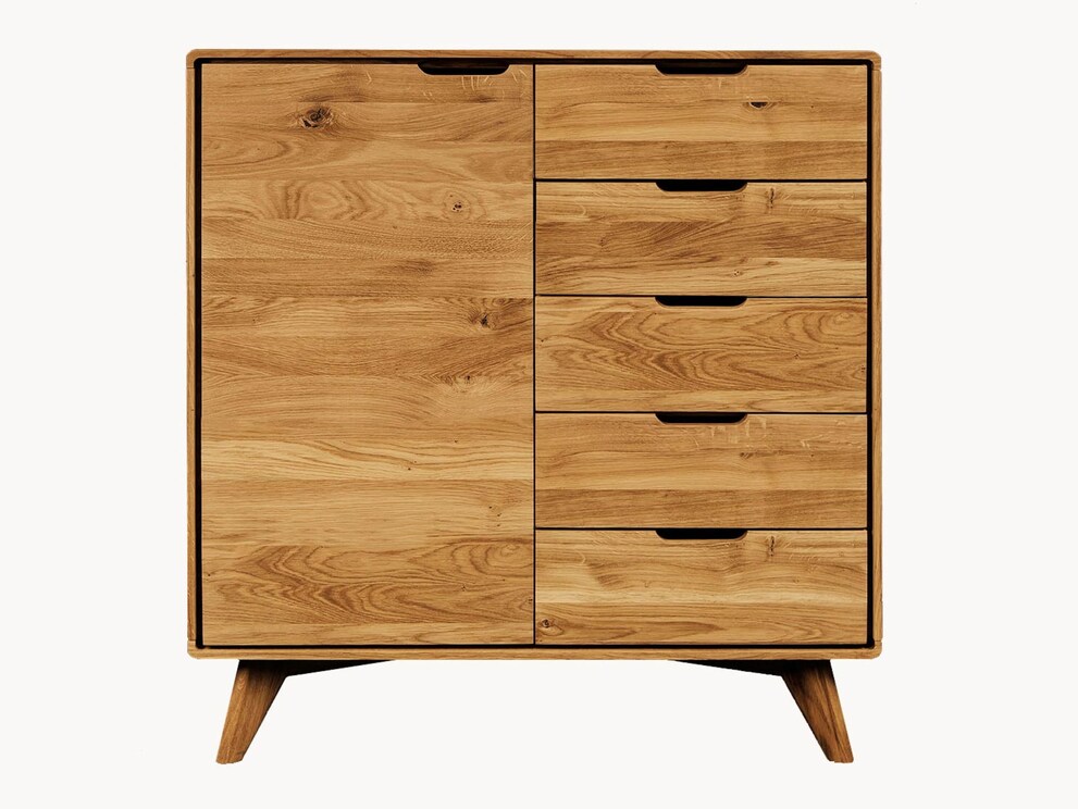 ...des encoches pratiques sont ici fraisées dans les portes et les tiroirs. Toutes les commodes offrent un contraste attrayant entre le corps arrondi et les portes et tiroirs aux lignes droites. Les pieds coniques apportent à la commode une impression de légèreté. Grâce aux 6 variantes différentes, elles sont toutes différentes et uniques. Il y a non seulement de la place pour des objets déco ou des magazines sur la commode, mais aussi beaucoup d’espace de rangement à l’intérieur du corps. Que des tiroirs, que des portes ou un mélange des deux : il y en a pour tous les goûts !