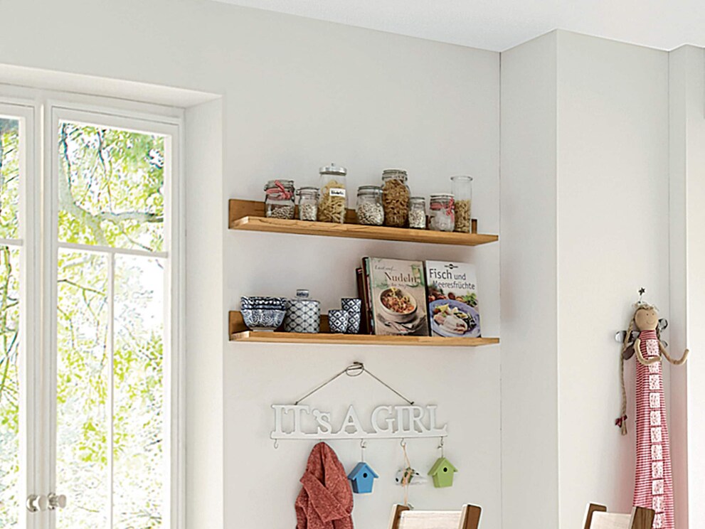 L'étagère flottante de cuisine « Culinara » est disponible en 2 largeurs et peut être parfaitement combinée. Deux étagères murales de même longueur, parfaitement adaptées à la hauteur de vos armoires suspendues, sont par exemple très esthétiques dans une cuisine.