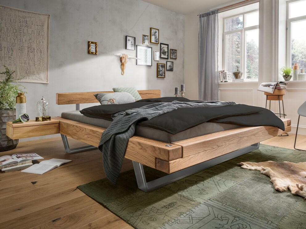 Das Schwebe-Balkenbett Madea erstrahlt in formschönem Wildeichenholz mit passendem Nachttisch