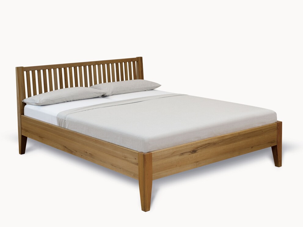 La tête de lit est mise en valeur par des barreaux verticaux travaillés avec soin et les pieds coniques sont fixés de façon marquante au cadre du lit. Ce lit en bois massif, testé sans substances nocives, est disponible en cœur de hêtre au veinage vivant ou en chêne sauvage raffiné.