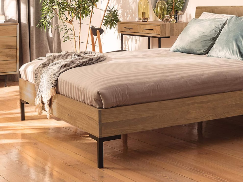 Ce lit élégant au cadre droit repose solidement sur de fins pieds d’angle noirs en métal. Pour un look minimaliste, choisissez « Parquetta » en version couchage sans tête de lit. Le lit devient alors un véritable bijou grâce à sa fascinante tête de lit ornée d’une marqueterie en chevrons. Ce beau lit est disponible selon vos envies en lit individuel ou lit double, en tout 7 largeurs – y compris en longueur confort 220 cm pour les personnes de grande taille. Vous avez également le choix de l’essence de bois : préférez-vous le chêne sauvage au veinage marqué ou le cœur de hêtre aux courbes élégantes ? Quel que soit votre choix, avec le lit en bois massif « Parquetta », vous transformez votre chambre en un cocon moderne et chaleureux.