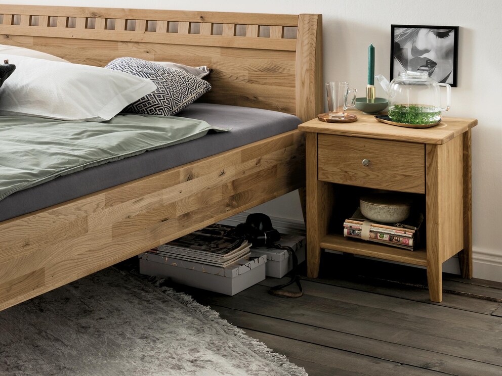 La table de nuit « Divina » s’accorde, grâce à son design élégant, non seulement au lit du même nom, mais aussi à de nombreux modèles en cœur de hêtre ou en chêne sauvage. Le plateau légèrement débordant, les pieds fuselés et le joli bouton en métal soulignent la ligne classique. Un tiroir et une étagère intermédiaire pratique répondent à toutes les attentes.