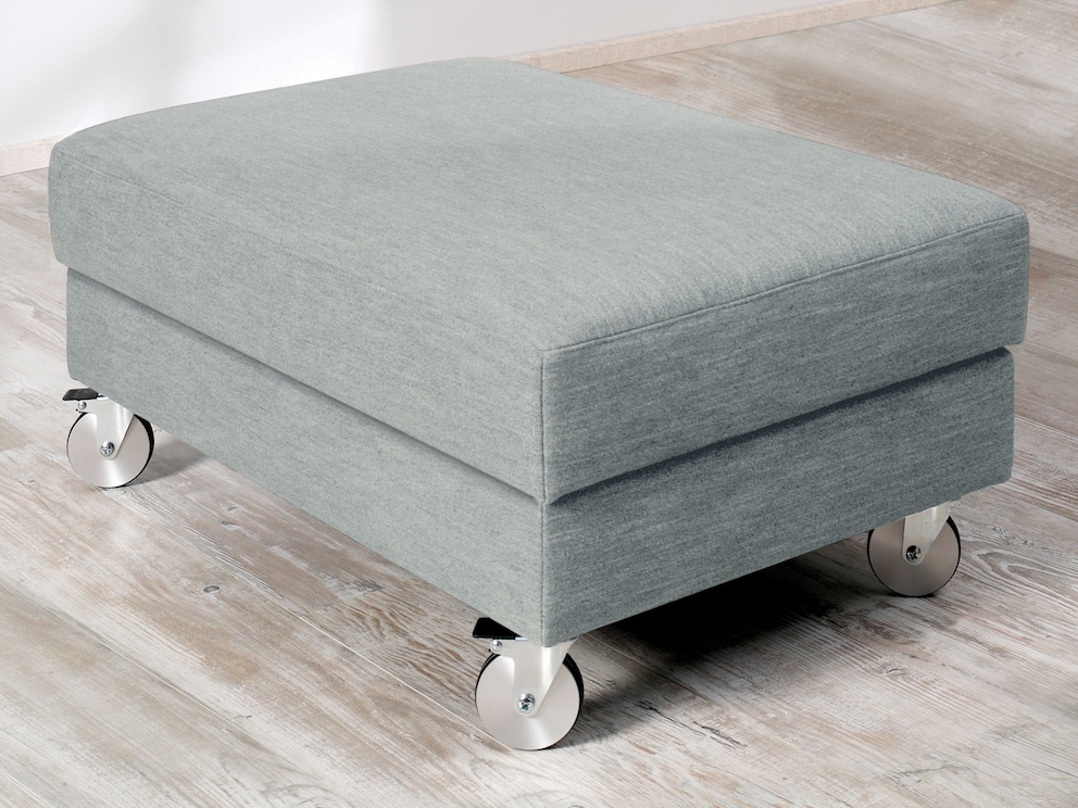 Ce pouf apporte la touche finale élégante aux canapés convertibles « Lucido ». Qu'il soit utilisé comme siège flexible ou comme repose-pieds confortable, il offre encore plus de confort au quotidien. Son espace de rangement intégré permet de ranger en un clin d'œil couvertures et coussins. Avec son design moderne et ses roulettes en aluminium ou en hêtre, ce pouf pratique complète l'ensemble avec élégance.