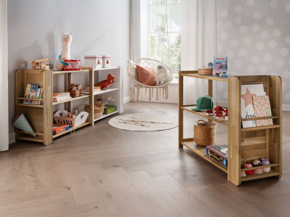 Les grands compartiments de l’étagère offrent suffisamment de place pour les jouets, le matériel d’apprentissage ou les trésors personnels. Grâce à la faible hauteur de l’étagère, votre enfant peut décider lui-même comment la garnir : ainsi, le sens de l’ordre est renforcé.